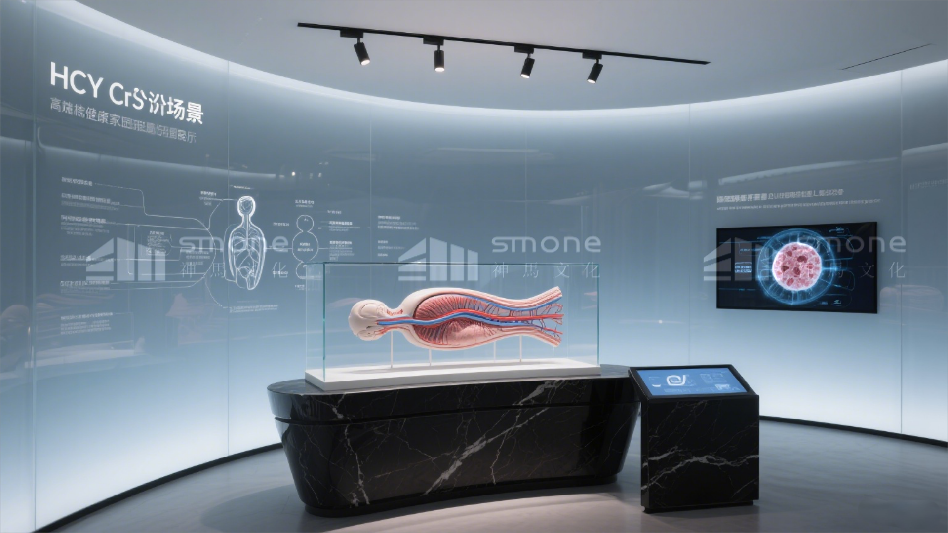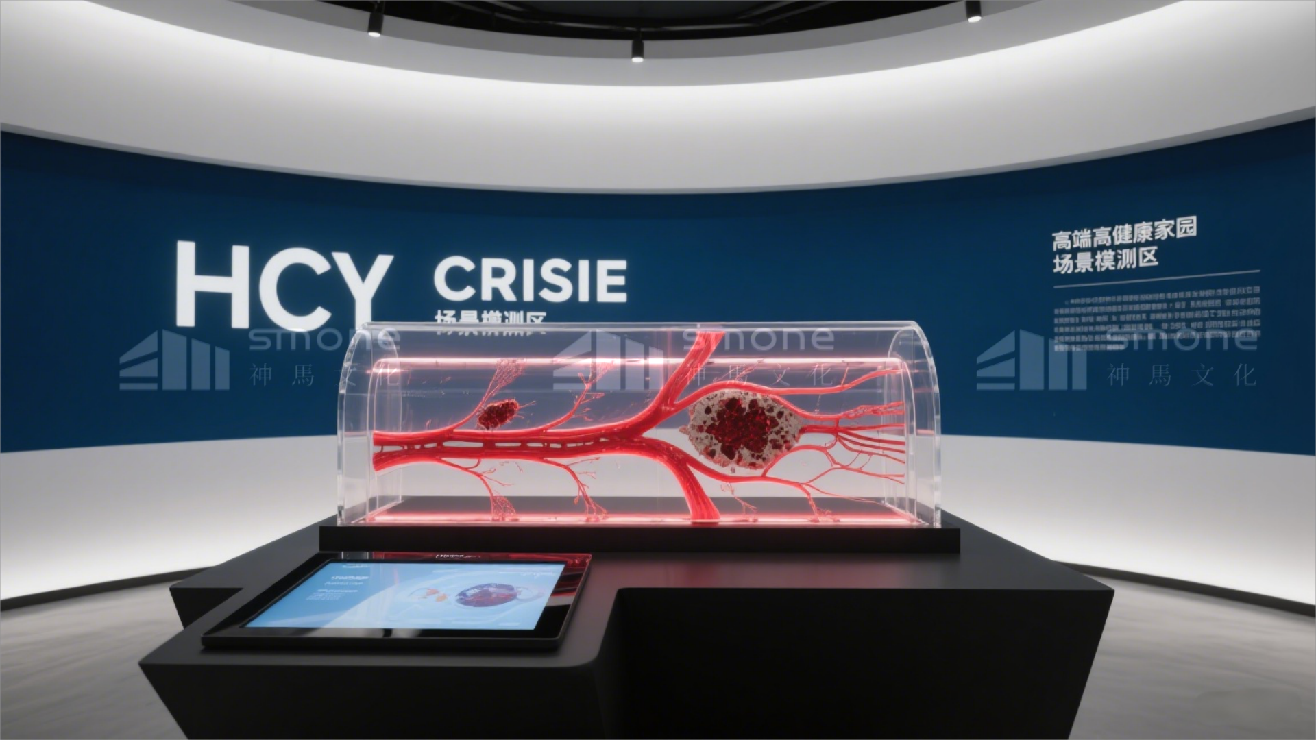 展廳設(shè)五大核心區(qū)域與兩大功能服務(wù)區(qū),形成完整健康服務(wù)鏈條:“科研溯源” 彰顯企業(yè)技術(shù)積淀,“解碼 HCY” 科普健康關(guān)聯(lián)知識,“破解之道” 展示核心解決方案,“健康家園” 打造沉浸式體驗,“健康長廊” 強(qiáng)化品牌信任;營銷服務(wù)區(qū)與診療服務(wù)區(qū)精準(zhǔn)對接需求,無縫銜接轉(zhuǎn)化環(huán)節(jié),兼具專業(yè)質(zhì)感與人文溫度。