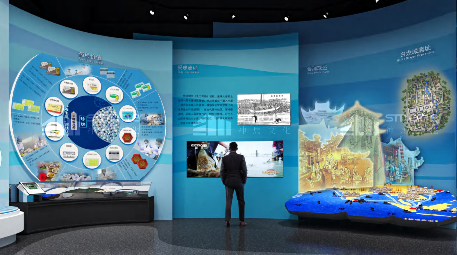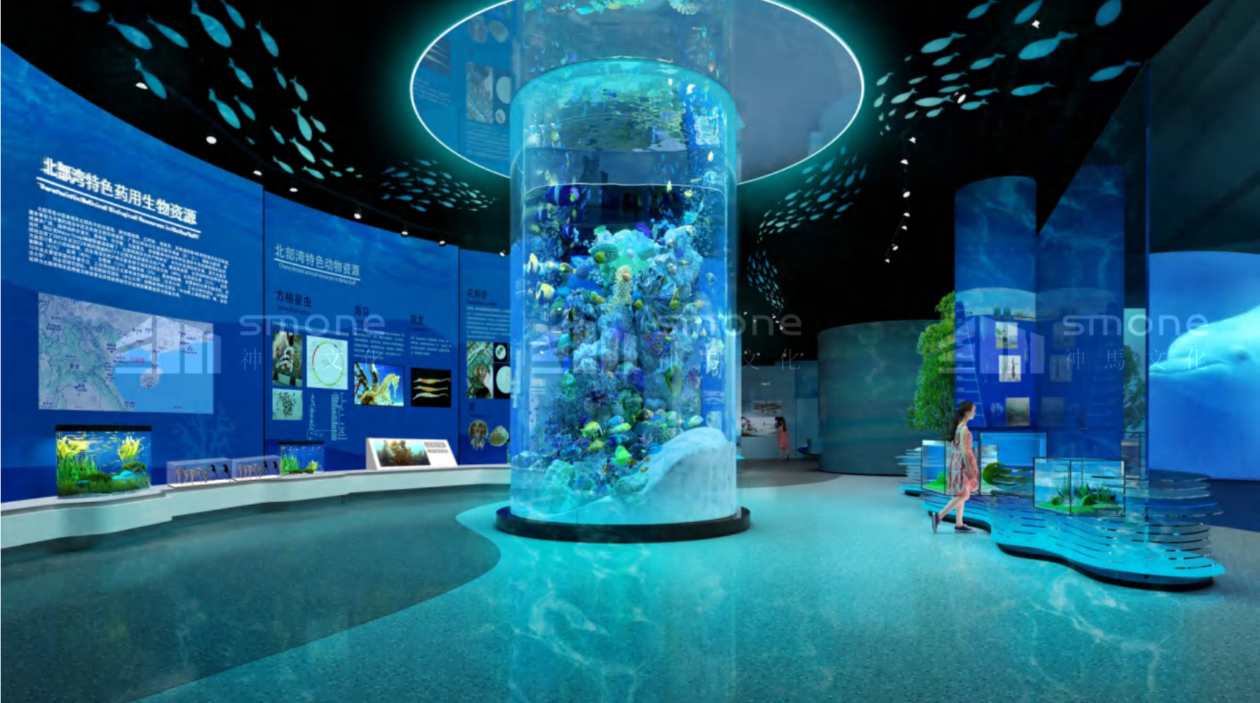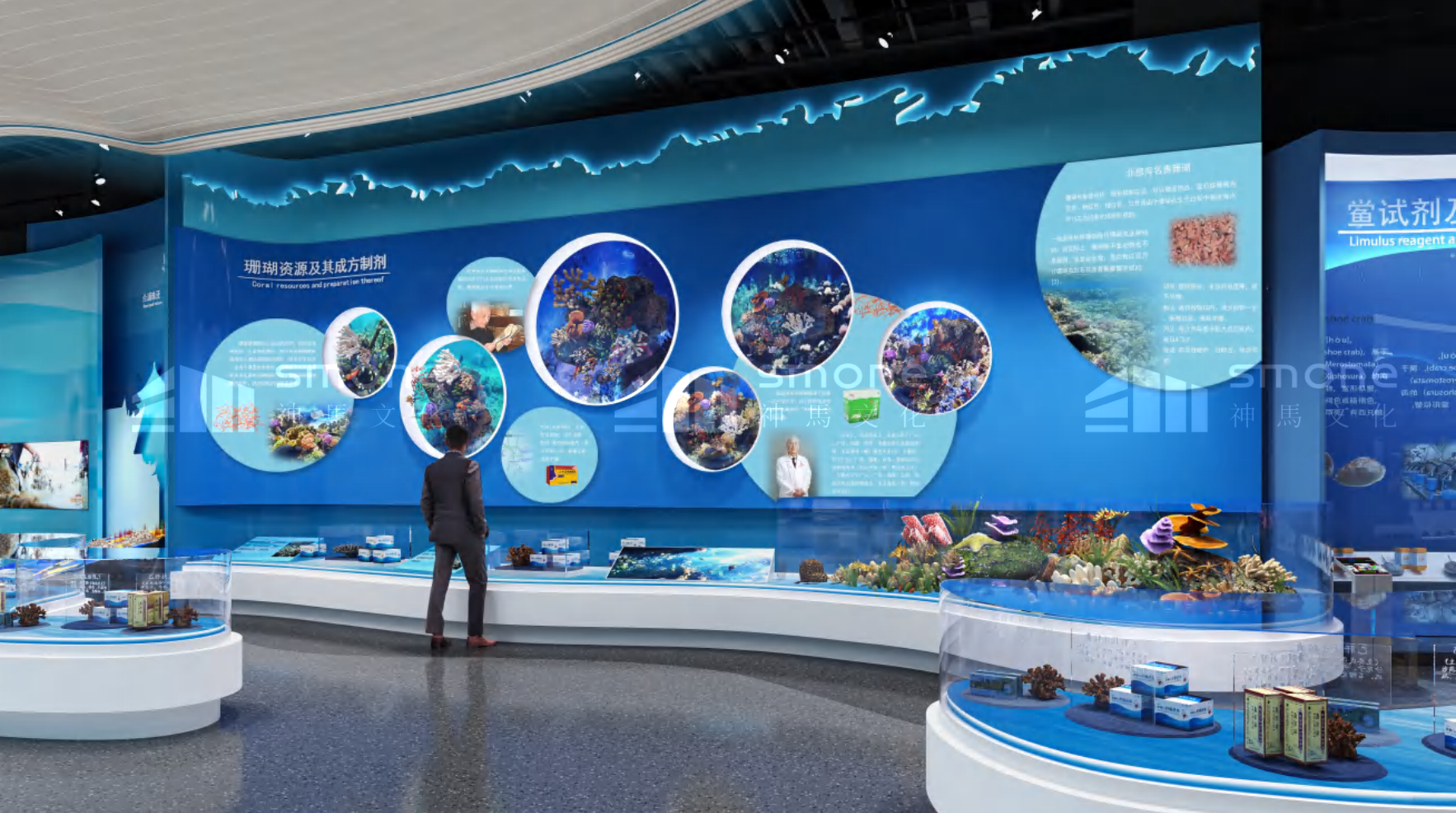海洋中藥館位于廣西壯族自治區,總面積 625 平,采用海洋生態融合科技互動風格。展廳策劃分為三部分:典籍里的海洋本草、神秘的北部灣海洋中藥、出發 —— 從蔚藍到未來,通過海洋生態標本臺、場景復原等多元展陳手法,構建從文化溯源到創新發展的完整脈絡,成為展示海洋中藥獨特價值的重要窗口。